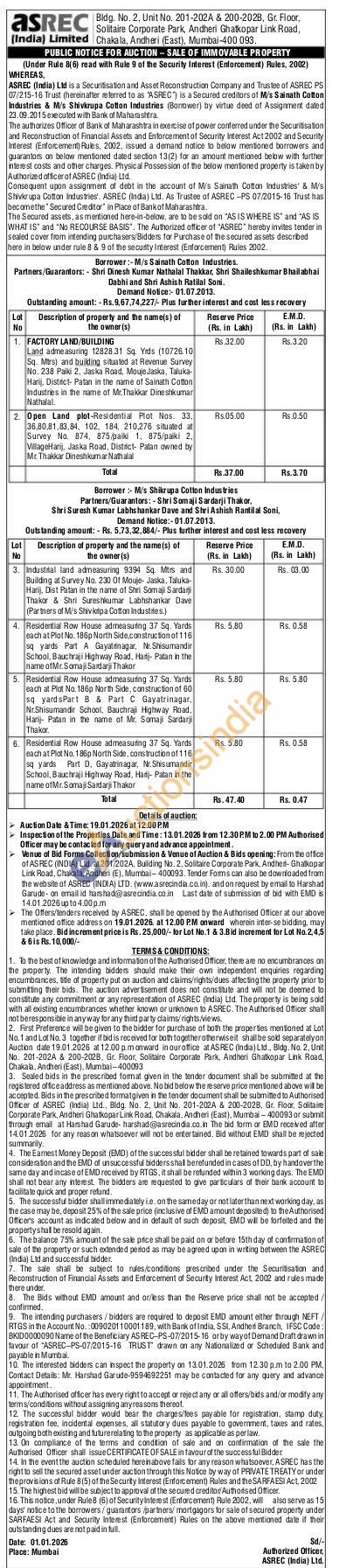 Land admeasuring 12828.31 Sq. Yrds (10726.10 Sq. Mtrs) and building situated at Revenue Survey No. 238 Paiki 2, Jaska Road, Mouje Jaska, Taluka-Harij, District-Patan in the name of Sainath Cotton Industries in the name of Mr.Thakkar Dineshkumar Nathalal