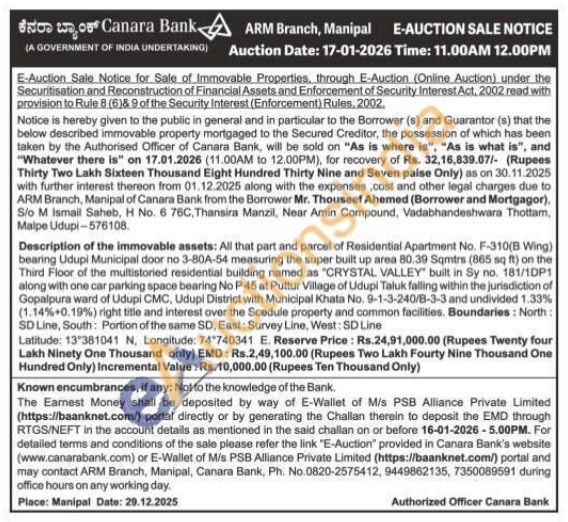 All that part and parcel of Residential Apartment No. F-310(B Wing) bearing Udupi Municipal door no 3-80A-54 measuring the super built up area 80.39 Sqmtrs (865 sq ft) on the Third Floor of the multistoried residential building named as "CRYSTAL VALLEY built in Sy no. 181/1DP1 along with one car parking space bearing No P45 at Puttur Village of Udupi Taluk falling within the jurisdiction of Gopalpura ward of Udupi CMC, Udupi District with Municipal Khata No. 9-1-3-240/8-3-3 and undivided 1.33% (1.14%+0.19%) right title and interest over the Scedule property and common facilities. Boundaries: North: SD Line, South: Portion of the same SD, East: Survey Line, West: SD Line