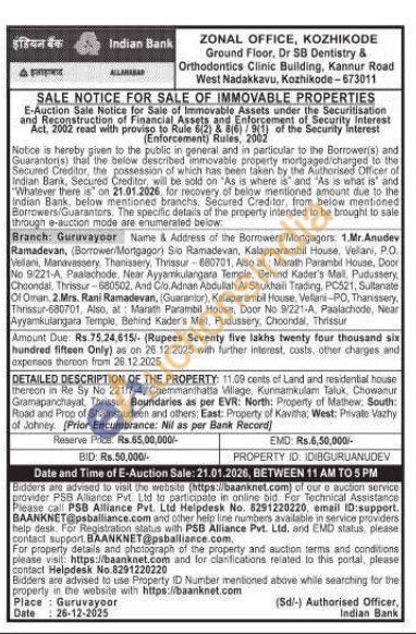 11.09 cents of Land and residential house Thereon in Re Sy No 22117-4, Chemmanihatta Village, Kunnamkulam Taluk, Chowanur Gramapanchayat Thrissur Boundaries as per EVR: North: Property of Mathew South: Road and Prop of Shamshudeen and others, East: Property of Kavitha, West: Private Vazhy of Jobney (Prior Encumbrance: Nil as per Bank Record)