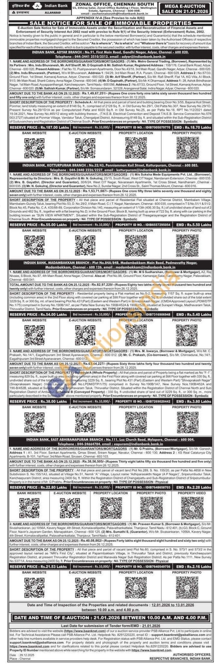 SHORT DESCRIPTION OF THE PROPERTY: Schedule A: All that piece and parcel of land and building bearing Door No.3/55, Bajanai Koil Street. Ponmar, land totally measuring an extent of 8148 Sq. ft., comprised of 2128 Sq. ft, in Old Survey No.29/1, Old Patta No.307, New Survey No.29/10, Present Survey No.29/1D1A as per Computerized Patta and 6020 Sq ft. in Old Survey No.25, as per Patta No.18, RPT No. 112/2021 dated 19.04.2021, New Survey No.465/12 along with building thereon.. (T.N.E.B. Electrical Connection and Deposit T.N.E.B. Service Connection No.578 003 2727) situated at Ponmar Village, Vandalur Taluk, Chengalpet District, Admeasuring 8148 Sq. ft. and situated within the Sub-Registration District of Guduvanchery and Registration District of Chennai South. Prior Encumbrances on property: Nil. TYPE OF POSSESSION: Symbolic