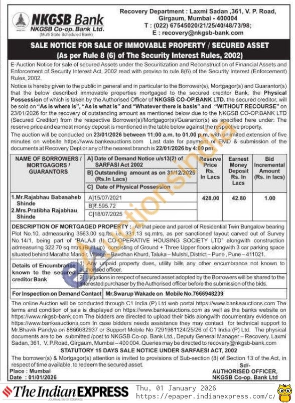 All that piece and parcel of Residential Twin Bungalow bearing Plot No. 10, admeasuring 3563.00 sq.fts, ie. 331.13 sq.mtrs, as per sanctioned layout carved out of Survey No.14/1, being part of "BALAJI (1) CO-OPERATIVE HOUSING SOCIETY LTD alongwith construction admeasuring 322.70 sq.mtrs. (Built up) consisting of Ground + Three Upper floors alongwith 3 car parking space situated behind Maratha Mandir, Village-Bavdhan Khurd, Taluka Mulshi, District-Pune, Pune-411021.