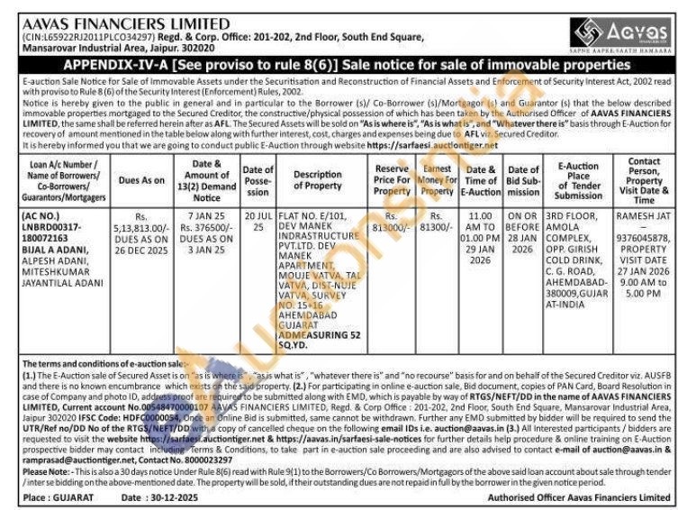FLAT NO. E/101, DEV MANEK INDRASTRUCTURE PVT.LTD. DEV MANEK APARTMENT, MOUJE VATVA, TAL VATVA, DIST-NUJE VATVA, SURVEY NO. 15-16 AHEMDABAD GUJARAT ADMEASURING 52 SQ.YD.