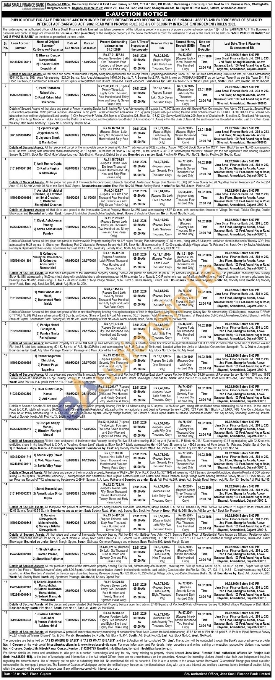 Details of Secured Assets: All that piece and parcel of Property bearing Duplex No.5, having Plot Area Admeasuring 86 Sq.yads i.e. 71.907 Sq.mtr alog with Ground Floor Construction Area Adms. 70 Sq.yards., Second Floor Construction Area Adms. 70 Sq.yards & Terrace Cabin Adms. 17 Sq. yards, Total Construction Area Adms. 157 Sq.yards (Super Built-up) standing thereon in the Scheme known as "SHREE TIRTH DUPLEX" a Scheme con-structed on freehold Non-Agricultural Land bearing (1) City Survey No. 647 Adm. 209 Sq.mtrs of Chalta No.125, Sheet No. 12 & (2) City Survey No.648 Adm. 209 Sq.mtrs of Chaita No.54, Sheet No.12, Total Land Admeasuring 418 Sq.mtr in Moje Nandej of Taluka Daskroi in the District of Ahmedabad and Registration Sub-District of Ahmedabad-11 (Aslali) within the State of Gujarat, the said Property is Bounded as under: East by: Other House, West by: Main Road, North by: Duplex No.6, South by: Duplex No.4.