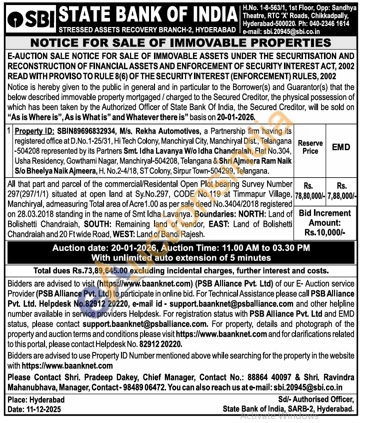 All that part and parcel of the commercial/Residental Open Plot bearing Survey Number 297(297/1/1) situated at open land at Sy.No.297, CODE No.119 at Timmapur Village, Manchiryal, admeasuring Total area of Acre 1.00 as per sale deed No.3404/2018 registered on 28.03.2018 standing in the name of Smt Idha Lavanya. Boundaries: NORTH: Land of Bolishetti Chandraiah, SOUTH: Remaining land of vendor, EAST: Land of Bolishetti Chandraiah and 20 Ft wide Road, WEST: Land of Bandi Rajesh
