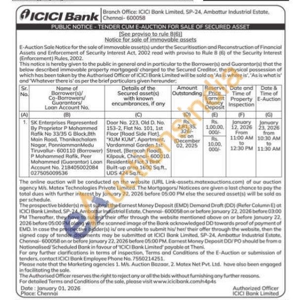 Door No. 223, Old D. No. 153-2, Flat No. 101, 1st Floor [Road Side Flat). "KUM KUM", Apartment, Vardammal Garden 1st Street, [Beracah Road). Kilpauk, Chennai-600010. Residential Flat 3 BHK Built-up area 1600 Sq.ft. UDS 424 Sq.ft.