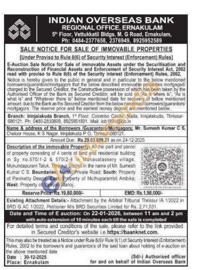 Description of the immovable Property: All the part and parcel of property consisting of 4 cents of land and residential building in Sy no.570/1-2 & 570/2-4 in Manavalassery village. Mukundapuram Taluk, Thrissur District in the name of Mr. Sumesh Kumar C S. Boundaries: North: Private Road, South: Property of Panikatty Deepa, East: Property of Muthuparambil Ambika, West: Property of Vaniyan Masoj