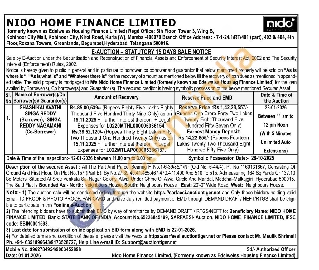 Description of the secured Asset: All The Part And Parcel Bearing H No.1-6-39/85/1/Nr (Old No. 6-44/4), Pti No 1160131867, Consisting Of Ground And First Floor, On Plot No.157 (Part B), Sy No.27,39,40,41,465,467,470,471,490 And 510 To 515, Admeasuring 164 Sq Yards Or 137.10 Sq Meters, Situated At Sree Venkata Sai Nagar Colony, Alwal Under Ghmc Of Alwal Circle And Mandal, Medchal-Malkajgiri Hyderabad 500015. The Said Flat Is Bounded As:- North: Neighbours House; South: Neighbours House; East: 20'-0" Wide Road; West: Neighbours House.