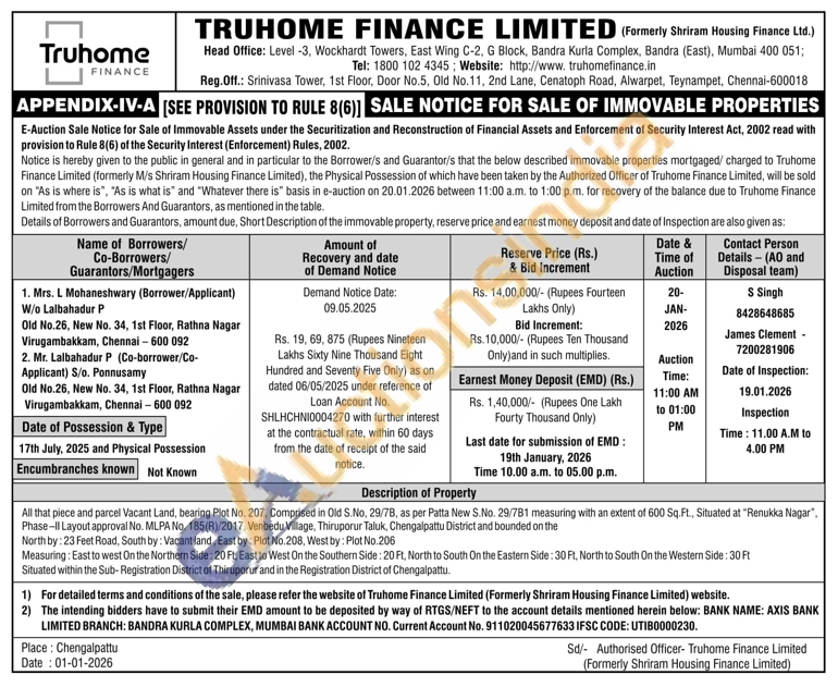 All that piece and parcel Vacant Land, bearing Plot No. 207, Comprised in Old S.No, 29/78, as per Patta New S.No. 29/781 measuring with an extent of 600 Sq.Ft., Situated at "Renukka Nagar", Phase-Il Layout approval No. MLPA No. 185(R)/2017, Venbedu Village, Thiruporur Taluk, Chengalpattu District and bounded on the North by: 23 Feet Road, South by: Vacant land, East by: Plot No. 208, West by: Plot No.206