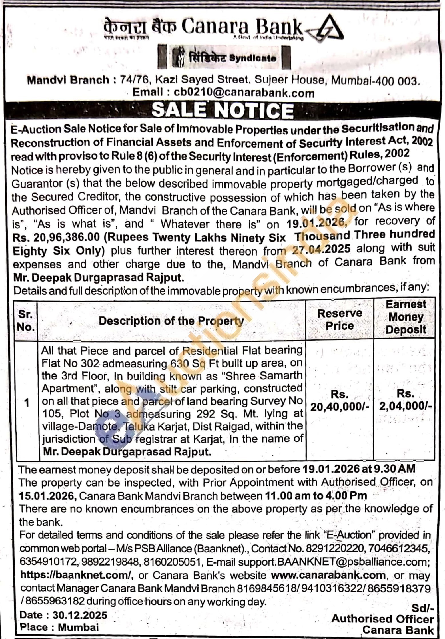All that Piece and parcel of Residential Flat bearing Flat No 302 admeasuring 630 Sq Ft built up area, on the 3rd Floor, In building known as "Shree Samarth Apartment", along with stilt car parking, constructed on all that piece and parcel of land bearing Survey No 105, Plot No 3 admeasuring 292 Sq. Mt. lying at village-Damote, Taluka Karjat, Dist Raigad, within the jurisdiction of Sub registrar at Karjat, In the name of Mr. Deepak Durgaprasad Rajput
