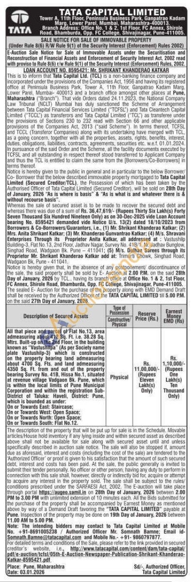 All that piece and parcel of Flat No.13, area admeasuring about 412 Sq. Ft. i.e. 38.28 Sq. Mtrs. Built-up on the 2nd Floor, in the building known as "Vastushilpa" (As per Society name plate Vastushilp-3) which is constructed on the property bearing land admeasuring about 4700 Sq. Fts. and land admeasuring 4350 Sq. Ft. from and out of the property bearing Survey No. 418, Hissa No.1, situated at revenue village Vadgaon Bk. Pune, which is within the local limits of Pune Municipal Corporation and within the registration Sub-District of Taluka: Haveli, District: Pune, which is bounded as under: On or Towards East: Staircase; On or Towards West: Open Space; On or Towards North: Open Space; On or Towards South: Flat No.12