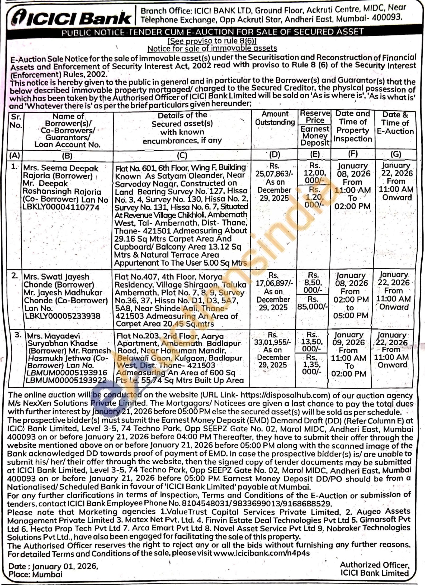 Flat No. 601, 6th Floor, Wing F. Building Known As Satyam Oleander, Near Sarvoday Nagar, Constructed on Land Bearing Survey No. 127, Hissa No. 3, 4, Survey No. 130, Hissa No. 2, Survey No. 131, Hissa No. 6, 7, Situated At Revenue Village Chikhloli, Ambernath West, Tal- Ambernath, Dist- Thane, Thane-421501 Admeasuring About 29.16 Sq Mtrs Carpet Area And Cupboard/Balcony Area 13.12 Sq Mtrs & Natural Terrace Area Appurtenant To The User 5.00 Sq Mtrs