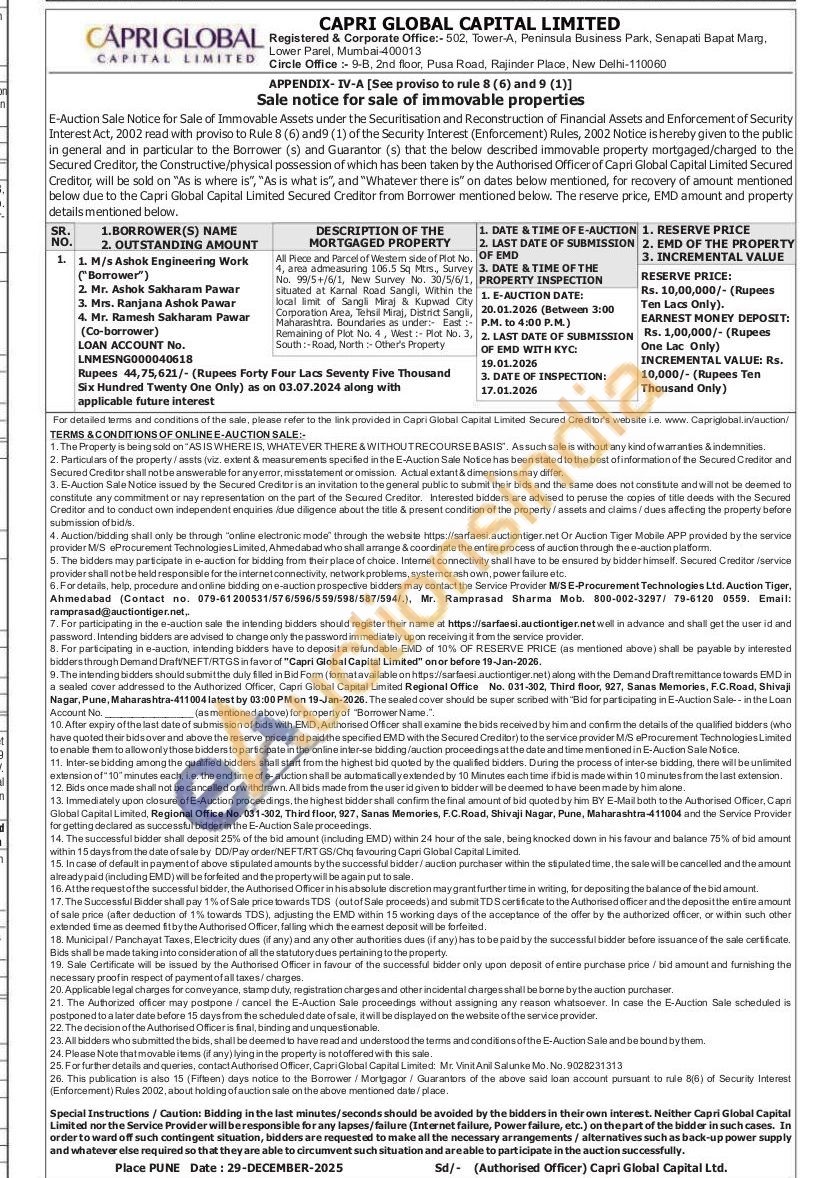 All Piece and Parcel of Western side of Plot No. 4, area admeasuring 106.5 Sq Mtis, Survey No. 99/5/6/1, New Survey No. 30/5/6/1, Kupwed Cly situated at Karnal Road Sangli, Within the local limit of Sangli Miraj & Kupwad City Corpo orporation Area, Tehsil Miraj, District Sangli, Maharashtra. Boundaries as under: East Remaining of Plot No. 4, West: Pict No. 3, South:-Road, North Other's Property
