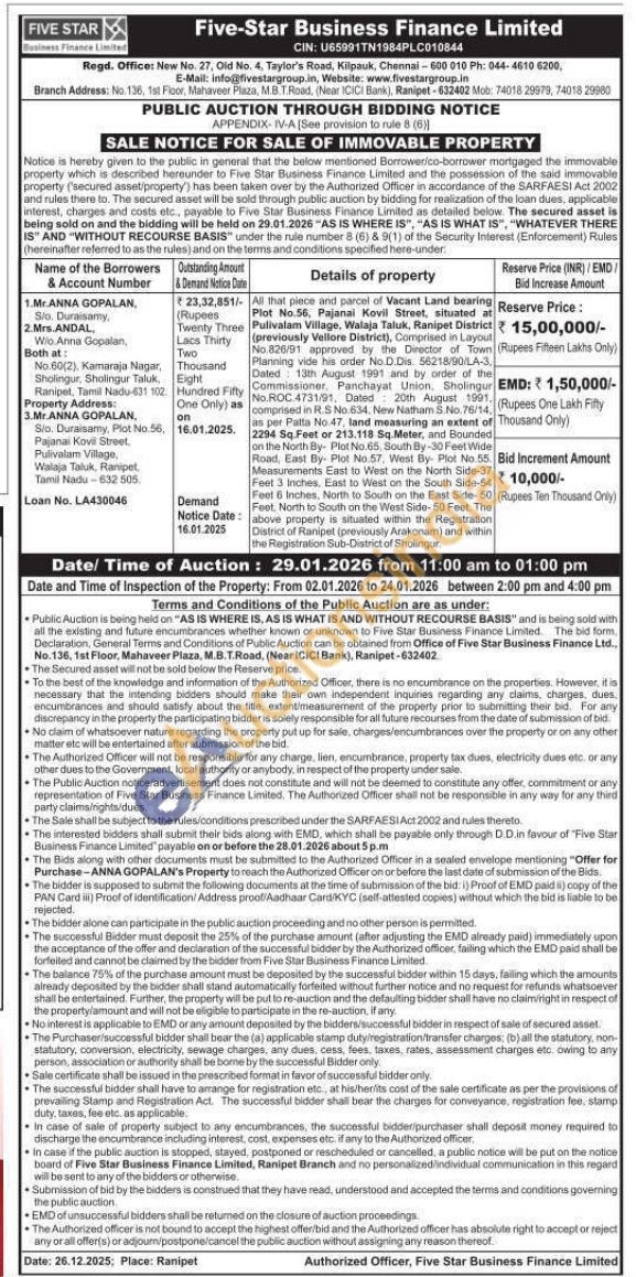 Al that piece and parcel of Vacant Land bearing Plot No.56. Pajanal Kovil Street, situated at Pulivalam Village, Wałaja Taluk, Ranipet District , Comprised in Layout (previously (previously Vellore No 826/91 approved by the Director of Town Ptanning vide his order No D.Dis. 56218/90/LA-3, Dated 13th August 1901 and by order of the Commissioner, Panchayat Union. Sholingur No.ROC 4731/91, Dated 20th August 1991, compnsed in R.S No 634, New Natham S.No. 76/14, as per Patta No. 47, land measuring an extent of 2294 Sq Feet or 213.118 Sq Meter, and Bounded on the North By Pist No 65, South By-30 Feet Wide Road, East By Plot No 57, West By- Plot No 55. to West on the North Side-37 Measurements East to North Side Feet 3 inches. East to West on the South Side-54 Feet & Inches, North to South on the East Side-50 Feet, North to South on the West Side-50 Feet. The above property is situated within the Registration (www Announ) dury pad District of Ranipet (previously Arakonam) and within the Registration Sub-District of Shalingur