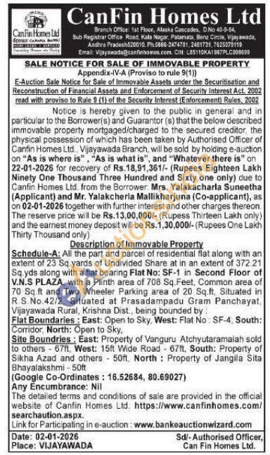 Schedule-A: All the part and parcel of residential flat along with an extent of 23 Sq yards of Undivided Share at in an extent of 372.21 Sq.yds along with a flat bearing Flat No: SF-1 in Second Floor of V.N.S PLAZA, with a Plinth area of 708 Sq. Feet, Common area of 70 Sq.ft and Two Wheeler Parking area of 20 Sq.ft. Situated in R.S.No.42/2, Situated at Prasadampadu Gram Panchayat, Vijayawada Rural, Krishna Dist., being bounded by Flat Boundaries: East: Open to Sky, West: Flat No: SF-4, South: Corridor, North: Open to Sky, Site Boundries: East: Property of Vanguru Atchyutaramalah sold to others 67ft, West: 15ft Wide Road 67ft, South: Property of Sikha Azad and others 50ft. North Property of Jangila Sita Bhayalakshmi-50ft