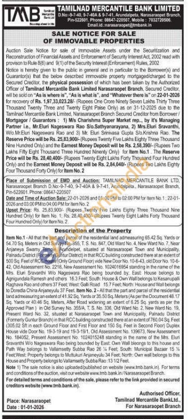 All that the part and parcel of the residential land admeasuring 65.42 Sq. Yards or 54.70 Sq. Meters in Old Survey No. 355, T. S. No. 847, Old Ward No. 4, New Ward No. 7, Near Anjaneya Swamy Temple, Arundelpet, situated at Narasaraopet Town and Municipality, Palnadu District (Formerly Guntur District) in that RCC building constructed there at an extent of 500 Sq. Feet of RCC House (Only Ground Floor) vide New Door No. 10-6-43, old Door No. 10-6-42. Old Assessment No. 2218, New Assessment No. 1024016954 standing in the name of the Mrs. Eluri Sravanthi Wio Nageswara Rao being bounded by, East. House belongs to Agnigundala Ramesh and others 16.3 Feet, South House & Own Wall belongs to Kesanupali Raghava Rao and others 37 Feet: West: Galli Road 157 Feet: North House and Wall belongs to Doredia China Anjaneyulu 37 Feet