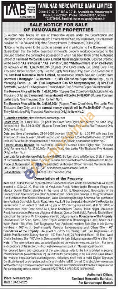 All that the part and parcel of the Residential vacant land to an extent of 1444.44 sq. yds or 1207.69 Sq.mts situated at D.No.301/C of Narasaraopet, Near Door No: 12-13-1, Near Krishnavers Towers, Talluri Nagar, vinukonda Road, Narasaraopet Revenue Village and Mandal, Guntur District(old), Palnadu DistrictNew) standing in the name of Mr. E. Nageswararao Sio Satyanarayana. Boundaries of the Property: (An extent of 722.22 Sq. Yards), East Repudi Varalakshmi Remaining Site-100, South: 24 F Width Road 65, West: Eluri Nageswara Rao (Applicant) westem Side Site in this Survey Numbers 100: North: Seethamasetty Venkata Satyanarayana and Others Site 65 Boundaries of the Property: An extent of 722.22 Sq. Yards), East Eluri Nageswara Rao