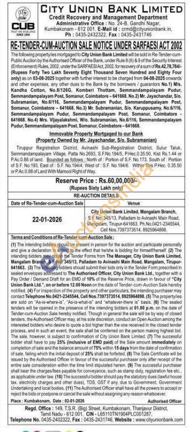 Tiruppur Registration District, Avinashi Sub-Registration District, Sulur Taluk, Semmandampalayam Village, Patta No.2693, S.F.No. 194/5, P.Hec.0.35.50, Kist Rs.1.44 or PAC 0.88 of land. Bounded as follows: North of Portion of S.F. No.173, South of Partion of S.F. No.193. East of: S.F. No. 194/4, West of: SF. No. 194/6. Within This P.Hec. 0.35.50 or P.Ac 0.88 of Land With Mamool Right of Way.