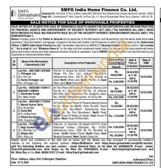 Plot No.-15. Khasra No.-416/23. Rameshwar Dham Village Pal, Teh Luni, Jodhpur, Raj-342014 Admeasuring Area 225.72 Sq. Yds. Bounde as Under North: Other Land, South: Plot No.-14. East: Other Land, West: Road 30ft