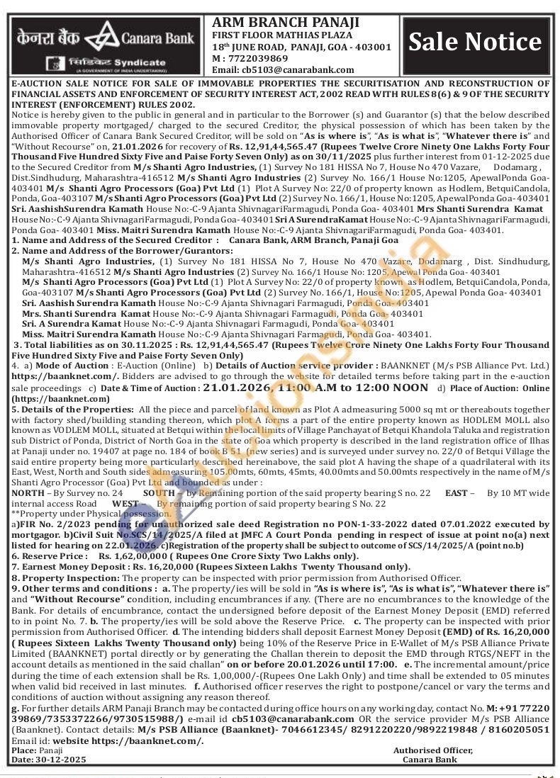 Details of the Properties: All the piece and parcel of land known as Plot A admeasuring 5000 sq mt or thereabouts together with factory shed/building standing thereon, which plot A forms a part of the entire property known as HODLEM MOLL also known as VODLEM MOLL, situated at Betqui within the local limits of Village Panchayat of Betqui Khandola Taluka and registration sub District of Ponda, District of North Goa in the state of Goa which property is described in the land registration office of Ilhas at Panaji under no. 19407 at page no. 184 of book B 51 (new series) and is surveyed under survey no. 22/0 of Betqui Village the said entire property being more particularly described hereinabove, the said plot A having the shape of a quadrilateral with its East, West, North and South sides admeasuring 105.00mts, 60mts, 45mts, 40.00 mts and 50.00mts respectively in the name of M/s Shanti Agro Processor (Goa) Pvt Ltd and bounded as under: NORTH-By Survey no. 24 SOUTH by Remaining portion of the said property bearing S no. 22 EAST By 10 MT wide internal access Road WEST By remaining portion of said property bearing S No. 22 **Property under Physical possession