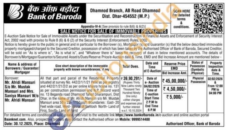 All that part and parcel of the Residential Property situated at survey No. 442/2/1/1/21 Peiki as per registry and 442/2/1/21/2/2 as per online khasra house no. 131 as per construction permission and N.P. Record ward no. 13 Beganda road Dhamnod Tahsil Dharampuri, Dist Dhar, in the name of Mr. Afridi Mansuri s/o Mr. Mustak Mansuri area 50 x 23-1150 sqft. Boundaries: East-20 Feet wide road, West-House of Santosh North-Land of Firoj, South-Land of Farid