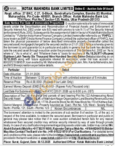 All that piece and parcels of land bearing Plot No.122 Admeasuring About 52.03 Sq.Mt. of Makhdum Nagar Organizedon Land Bearing Revenue Survey No.94/2-36,177/8-25 and its Block No.98, New Block No.110 of Kothwa Sub- District Mangrol, District Surat Property bounded as: East- Plot No. 125, West: Society Road North:-Plot No. 121, South:-Plot No. 123