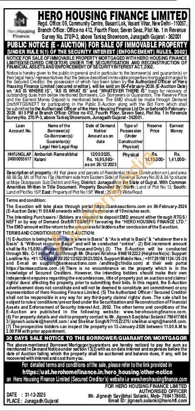 Description of property: Al that piece and parcels of Residential House Construction on Land area 68.56 Sq. Mt. of Plot no 15p (Northern side from Eastern Side) of Revenue Survey No 20 & 24/1p situate at Moje Dolatpara in Sub District and Reg. District: Junagadh in the State of Gujrat. With Common Amenities Written in Title Document. Property Bounded By: North: Land of Plot No 13. South: Land of Plot No 15P. East: Property of Plot No 15P, West: 25.00 Fit Wide Road