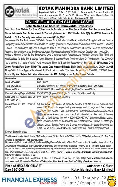 All that piece and parcel of property bearing Flat No. C/004, admeasuring around 46.45 sq. mers super builtup ares on ground floor (ground Floor, as per approved Planby AMC) with undividedrightin the land and common amenities of the scheme known as Navjivan Flaf, situated on the land of Survey No.1071/2 (old Survey No. 1071+1075-1076-1079/2) of Mouje'village: Vatva More specific situated on the land of Final Plot No.33/2 of TPS No.86 of Mouje village, Valve, Taluka: Valva and Distrid Ahmedabad, Property bounded as East: Flat No. C1003, West Block-D. North Parking South: Compound Wall