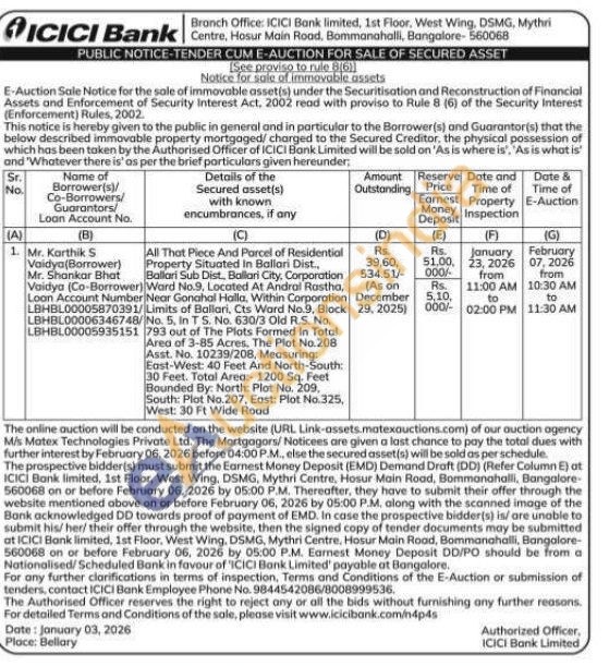 All That Piece And Parcel of Residential Property Situated in Ballari Dist., Ballari Sub Dist, Ballari City, Corporation Ward No.9, Located At Andral Rastha, Near Gonahal Halla, Within Corporation Limits of Ballari, Cts Ward No.9, Block No. 5, In T S. No. 630/3 Old R.S. No. 793 out of The Plots Formed In Total Area of 3-85 Acres. The Plot No.208 Asst. No. 10239/208, Measuring: East-West: 40 Feet And North-South: 30 Feet. Total Area: 1200 Sq. Feet Bounded By: North: Plot No. 209, South: Plot No.207, East: Plot No. 325, West: 30 Ft Wide Road