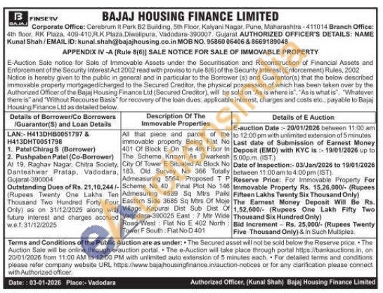 All that piece and parcel of the immovable property Being Flat No 401 Of Block E On The 4th Floor in The Scheme Known As Dwarkesh City Of Tower E Situated At Block No 183, Old Survey No 366 Totally Admeasuring 5564. Proposed TP Scheme No 40, Final Plot No 146 Admesuring 4589 Sq Mirs Paiki Eastern Side 3685 Sq Mtrs Of Moje Village Kapurai Dist Sub Dist Of Vadodara-390025 East: 7 Mtr Wide Road West: Fiat No E 402 North Tower F South Flat NoD 401