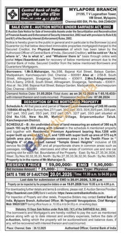 Schedule A: All that piece and parcel of Vacant Land measuring of 249.00 cents (108464.40 sq.ft) in Survey Nos. 27/1 part, 30/2 part, 30/3, 30/4,30/5 part, 30/6 part, 30/7 part, 35/2 part, 35/3 part, 33/2 part, 35/1, 32/7 part, 33/3 part situated at Old No.135, New No.99, Mathur Village, Sriperumbudur Taluk, Kancheepuram District. SCHEDULE-B: An undivided share of land measuring an extent of 386 sq.ft (each 193 sq.ft) UDS along with interest in the schedule A mentioned property and together with Residential Premium Apartment bearing Nos.1208 with super built up area of 575 sq.ft, and 1209 with super built up area of 575 sq.ft (plinth area plus a proportionate common area) in the Twelth Floor in Heights 4" of the project named "Temple Green Heights" inclusive of EB service No.095620111257 and all proportionate share in common areas such as passages, lobbies, lifts, staircases and other areas of common use and one car parking slot for each flat. Boundaries of the Property: East: Sy No.27,35,34,3036, West: Sy. Nos 30,32,35,33, North: Sy.No. 27.35.33,36,32,30, South: Sy. No.30835. Property is in the name of Mr.Maharajan S.