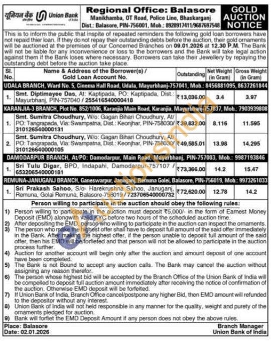 Union Bank of India Gold Auctions Auction in Balasore