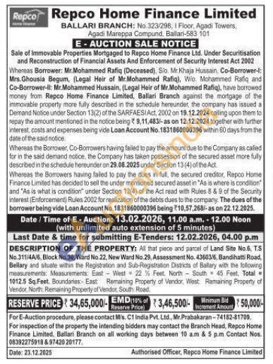 All that piece and parcel of Land Site No.6, T.S No.311/44/6, Block No.30, Ward No.22, New Ward No.29, Assessment No. 43603/6, Bandihatti Road, Bellary and situate within the Registration and Sub-Registration Districts of Ballary with the following measurements: Measurements. East West 22% Feet North South 45 Feet. Total 1012.5 Sq Feet. Boundaries- East Remaining Property of Vendor, West Remaining Property of Vendor North Remaining Property of Vendor, South Road,