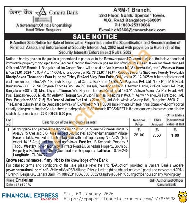 All that piece and parcel of the land bearing Sy. No. 54, 55 and 902 measuring 0.77 Ares, 9.75 Ares and 3.64 Ares respectively located at Chendamangalam Village, Paravur Taluk, Emakulam District together with building bearing No. 1/527 (Total extent 14.16 Ares) and bounded as follows: East by: B Schedule Property & Thodu, West by: River, North by: Private Road & B Schedule Property, South by: Property of Puthenveetil Shelly Coordinates of the property, Latitude-10.186240, Longitude 76.204772