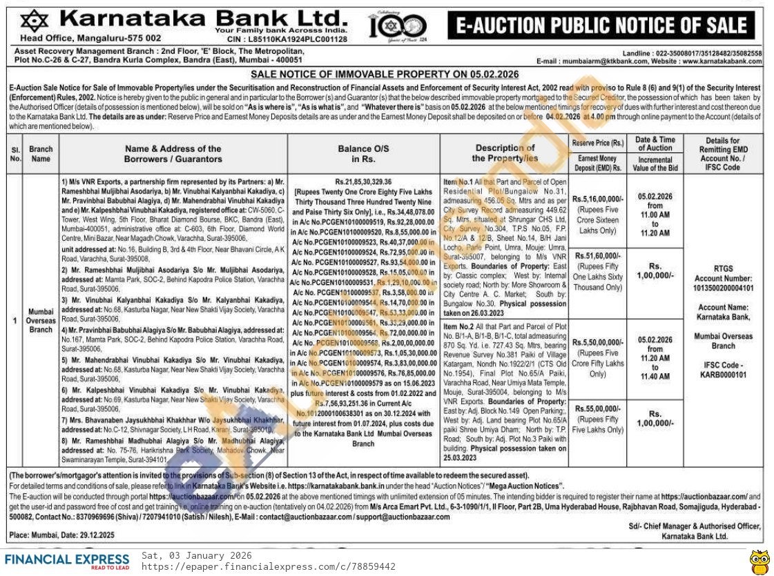 Item No.1 All that Part and Parcel of Open Residential Plot/Bungalow No.31, admeasuring 456.05 Sq. Mtrs and as per City Survey Record admeasuring 449.62 Sq. Mtrs, situated at Shrungar CHS Ltd. City Survey No.304. T.PS No.05, FP No.12/A & 12/8, Sheet No.14, BIH Jani Locho, Parle Point, Umra, Mouje: Umra Surat-395007, belonging to Mis VNR Exports Boundaries of Property: East by: Classic complex: West by: Intemal society road, North by More Showroom & City Centre A. C. Market; South by: Bungalow No.30. Physical possession taken on 26.03.2023
