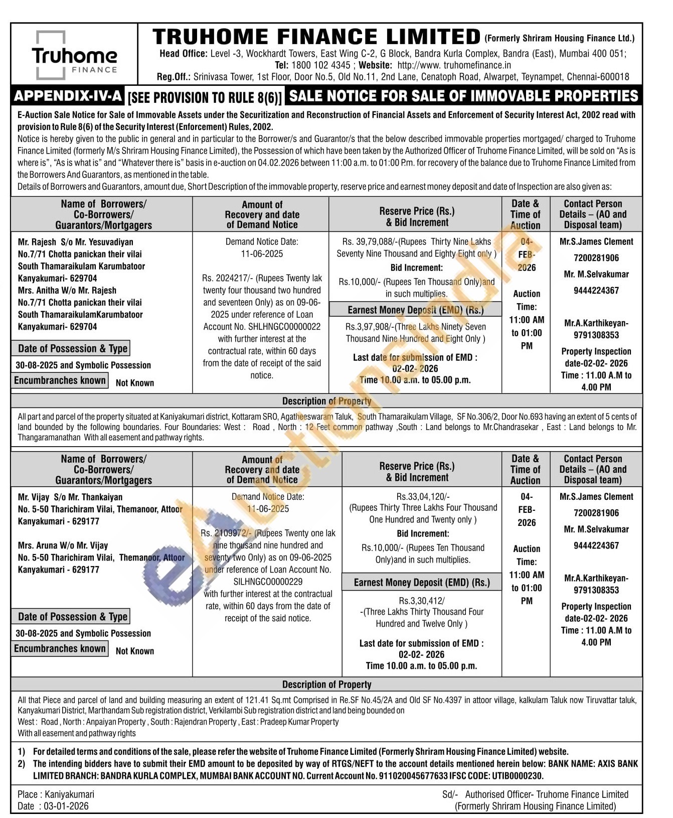All that Piece and parcel of land and building measuring an extent of 121.41 Sq.mt Comprised in Re.SF No.45/2A and Old SF No.4397 in attoor village, kalkulam Taluk now Tiruvattar taluk, Kanyakumari District, Marthandam Sub registration district, Verkilambi Sub registration district and land being bounded on West: Road, North: Anpaiyan Property, South: Rajendran Property, East: Pradeep Kumar Property With all easement and pathway rights