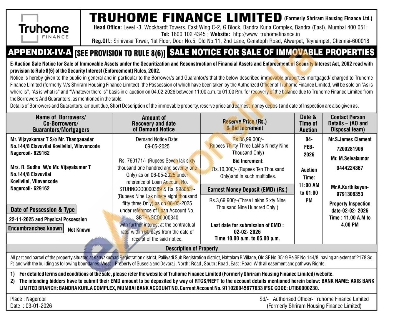 All part and parcel of the property situated at Kanyakumari Registration district, Palliyadi Sub Registration district, Nattalam B Village, Old SF No.3519 Re SF No.144/8 having an extent of 2178 Sq. Ft land with the building as following boundaries: West: Property of Suseela and Devaraj, North: Road, South: Road, East: Road With all easement and pathway Rights.