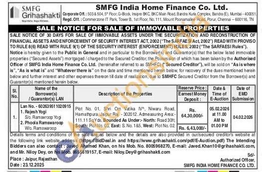 Plot No. 01, Shri Om Vatika IV, Niwaru Road, Hamathpura, Jaipur Raj.-302012. Admeasuring Area 111.11 SqYds. Bounded As Under: North: Road 30ft, South: Plot No. 03. East: S. No. 185. West: Plot No. 02