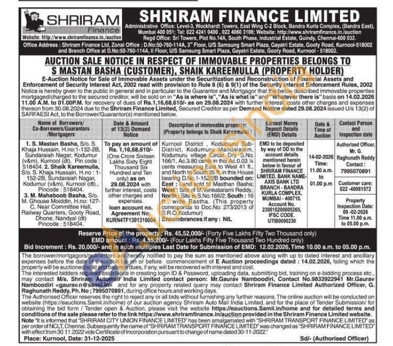 Kurnool District, Kodumuru Sub-District, Kodumuru Mandalalam, Kodumuru village Circar Dry. S.No. 166/1, Ac.3.80 cents in this Ac.0.03% cents measuring East to West 41 ft., and North to South 35 ft, in this House bearing D.No.1-152/28 bounded on: East: Land sold to Masthan Basha; West: Site of M. Venkatarami Reddy; North: Site in S.No. 166/2; South : 16 ft., wide Rastha. (This property corresponds to Doc.No: 273/2013 of S.R.O. Kodumur)