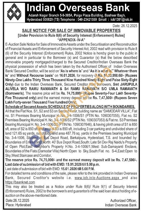 All that the Flat Nos. S1, S2 and S3 on Second Floor, building name as "DAMODAR VILLA", Flat no. S1 Premises Bearing Municipal H. No. 3-4-1006/S1 (PTIN No. 1090307055), Flat no. S2 Premises Bearing Municipal H. No. 3-4-1006/S2 (PTIN No. 1090307053) & Flat no. S3 Premises Bearing Municipal H. No. 3-4-1006/S3 (PTIN No. 1090307646), & having plinth area of S1 is 850 sft, area of S2 is 850 sft and area of S3 is 850 sft, including 3 car parking and undivided share of land 121.65 sq yards, out of total land area 487.76 sq. yards in the Premises bearing Municipal No. 3-4-1006, Situated at Bus Depot Road, Barkatpura, Hyderabad, T.S. and bounded by: Boundaries of Entire Land: North: 40' Bus Depot Road, South: Late Sri Dev Raj Naidu's Property of Open Plot, East: Neighbor's Property H.No. 3-4-1006/1, West: Sub-Damayanti Enclave, Boundaries of the Flats (Damodar Villa): North: Open to Sky, South: Flat no. S-4, East:Open to Sky, West: Staircase and Corridor,
