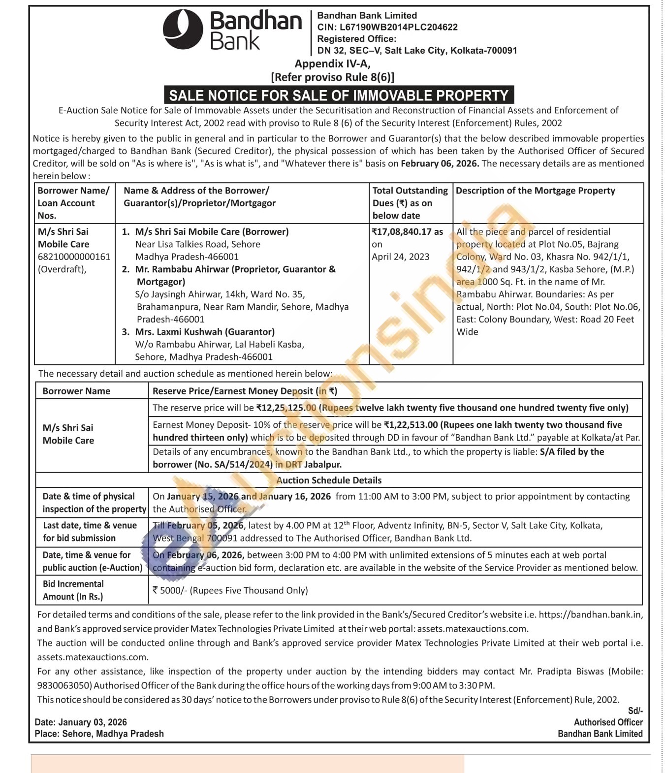 All the piece and parcel of residential property located at Plot No.05, Bajrang Colony, Ward No. 03, Khasra No. 942/1/1, 942/1/2 and 943/1/2, Kasba Sehore, (M.P.) area 1000 Sq. Ft. in the name of Mr. Rambabu Ahirwar. Boundaries: As per actual, North: Plot No.04, South: Plot No.06, East: Colony Boundary, West: Road 20 Feet Wide