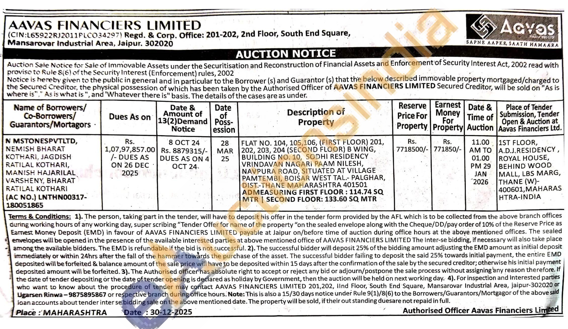FLAT NO. 104, 105,106, (FIRST FLOOR) 201, 202, 203, 204 (SECOND FLOOR) B WING, BUILDING NO. 10, SODHI RESIDENCY VRINDAVAN NAGARI PAAM NILESH, NAVPURA ROAD, SITUATED AT VILLAGE PAMTEMBI, BOISAR WEST TAL.- PALGHAR, DIST.-THANE MAHARASHTRA 401501