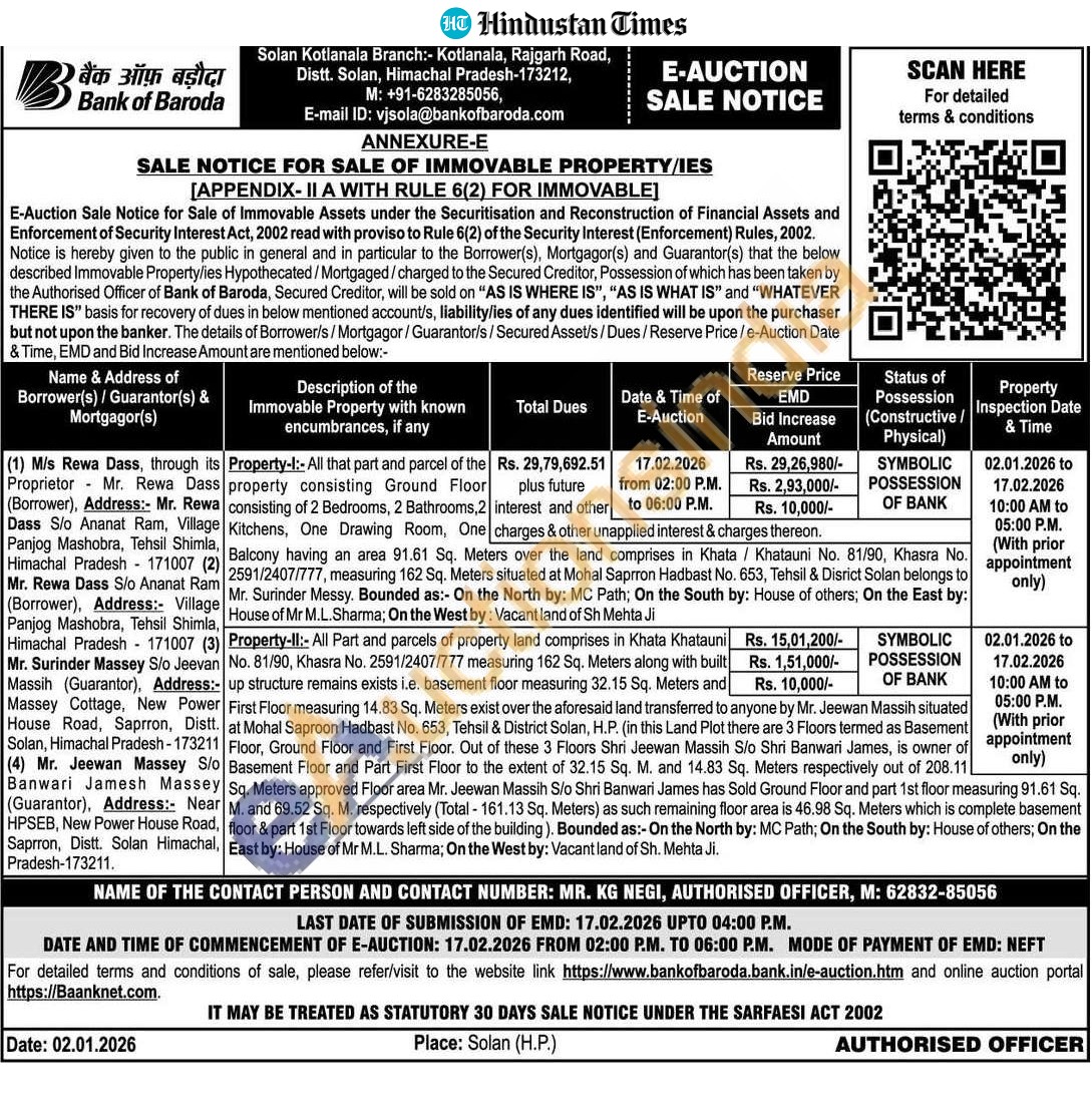All that part and parcel of the property consisting Ground Floor consisting of 2 Bedrooms, 2 Bathrooms 2 Kitchens, One Drawing Room, One Balcony having an area 91.61 Sq. Meters over the land comprises in Khata / Khatauni No. 81/90, Khasra No. 2591/2407/777, measuring 162 Sq. Meters situated at Mohal Saprron Hadbast No. 653, Tehsil & Disrict Solan belongs to Mr. Surinder Messy. Bounded as:- On the North by: MC Path; On the South by: House of others; On the East by: House of Mr M.L.Sharma; On the West by: Vacant land of Sh Mehta Ji