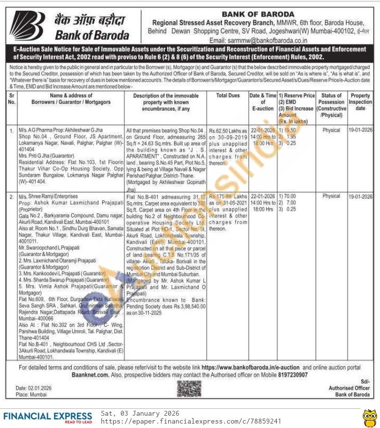 Flat No.B-401 admeasuring 31.12 Sq.mirs. Carpet area equivalent to 335 Sq.ft. Carpet area on 4th Floor in the building No.2 of Neighbourhood Co-operative Housing Society Ltd, Situated at Plot HD-1, Sector No. III, Akurli Road, Lokhandwala Township, Kandivali (East), Mumbai-400101, Constructed on all that piece or parcel of land bearing C.T.S No.171/35 of village- Akurli, Taluka- Borivali in the registration District and Sub registration District and Sub-District Mumbai City and Mumbai Suburban (Mortgaged by Mr. Ashok Kumar L Prajapati and Mr. Laxmichand O Prajapati)