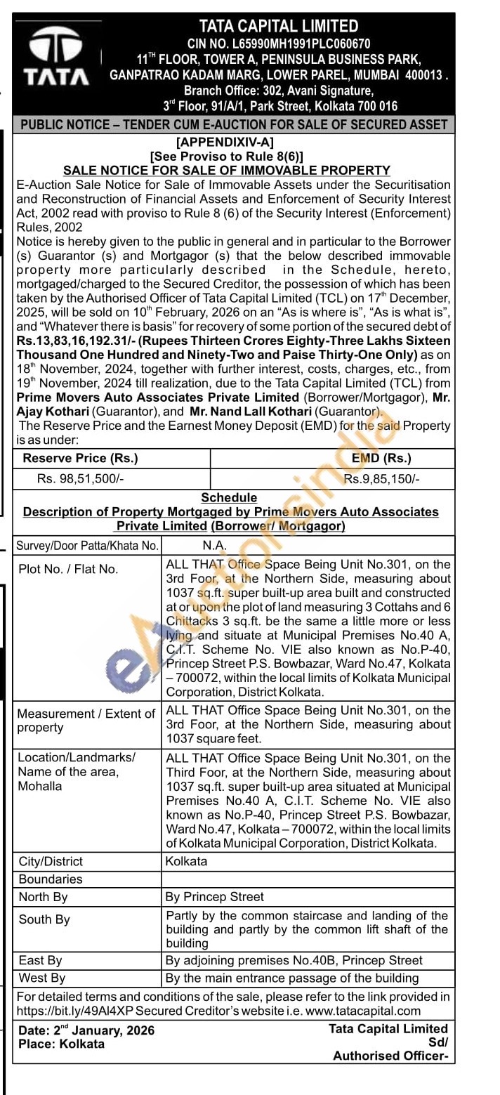 ALL THAT Office Space Being Unit No.301, on the 3rd Foor, at the Northern Side, measuring about 1037 sq.ft. super built-up area built and constructed at or upon the plot of land measuring 3 Cottahs and 6 Chittacks 3 sq.ft. be the same a little more or less lying and situate at Municipal Premises No.40 A, C.I.T. Scheme No. VIE also known as No.P-40, Princep Street P.S. Bowbazar, Ward No.47, Kolkata -700072, within the local limits of Kolkata Municipal Corporation, District Kolkata,