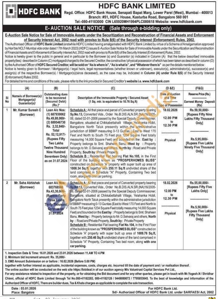 Schedule A: All that piece and parcel of Converted property bearing Sy.No.13, Converted Vide, Order No.B.DIS.ALN.SR. (NA)16/2005-06, dated 02-01-2006 passed by the Special Deputy Commissioner, Bangalore, situated at Chikkabettahalli Village, Yelahanka Hobli Bangalore North Taluk presently within the administrative jurisdiction of BBMP measuring 0-13 Guntas (East to West 170 Feet and North to South 75 Feet plus 1234 Square Feet totally measuring 14,000 Square Feet) and bounded on the East by: Property belongs to Smt. Shaheen Banu, West by: Property belongs to Mr. D.Seivaraj and others, North by: Road and Private Property, South by: Private Property Schedule B: Residential Flat bearing Flat No.105, in the First Floor of the building known as "PROSPERHOMES BLISS" constructed on Schedule 'A' property with super built up area of 1008.34 Sq.ft. together with 250.11 Sq.ft undivided share of the land comprised in Schedule "A" Property, Containing Two bed room, along with one car parking.