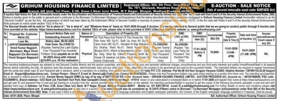 All That Piece And Parcel Of The House No. 184. Plot Area 450 Sq. Ft., Built Up Arsa 90 SFL. Open Area 360 Sq Ft. Situated At Bag Mahamas Ka Shahar, Ward No.41. Tehsil Huzur, Distt. Bhopal (MP), Which le Bounded As Under East By Way West By Other's Property, North By-House Of Jawahar Lal Sahu, South By House Of Ashok Chaturved