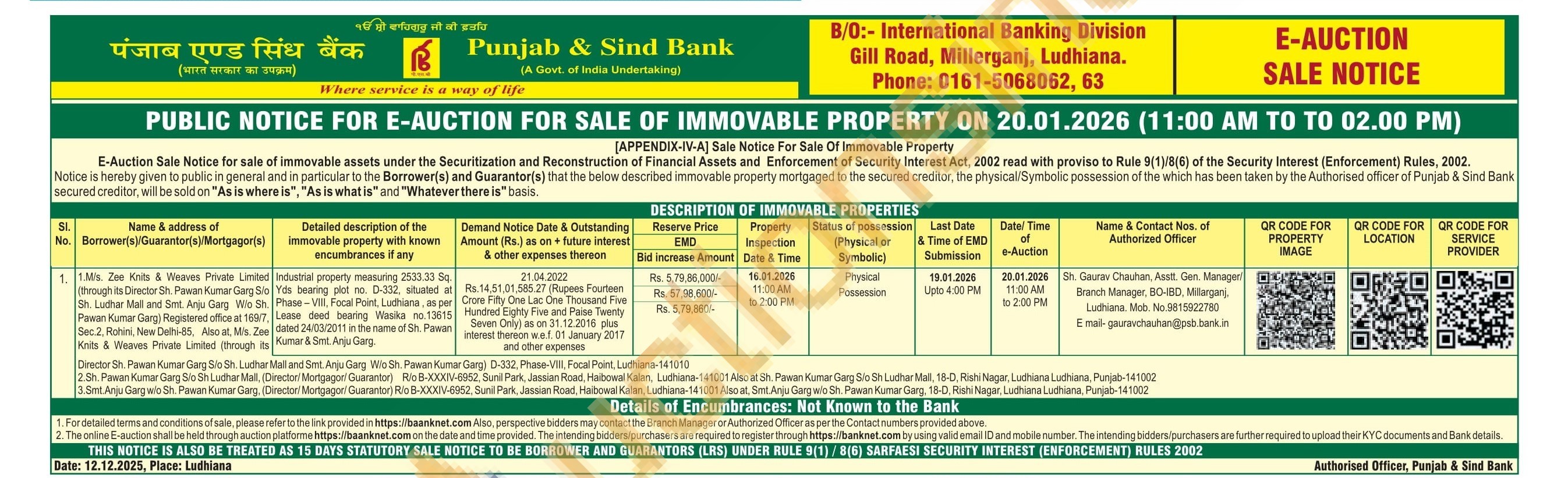 Industrial property measuring 2533.33 Sq. Yds bearing plot no. D-332, situated at Phase- VIII, Focal Point, Ludhiana, as per Lease deed bearing Wasika no.13615 dated 24/03/2011 in the name of Sh. Pawan Kumar & Smt. Anju Garg.