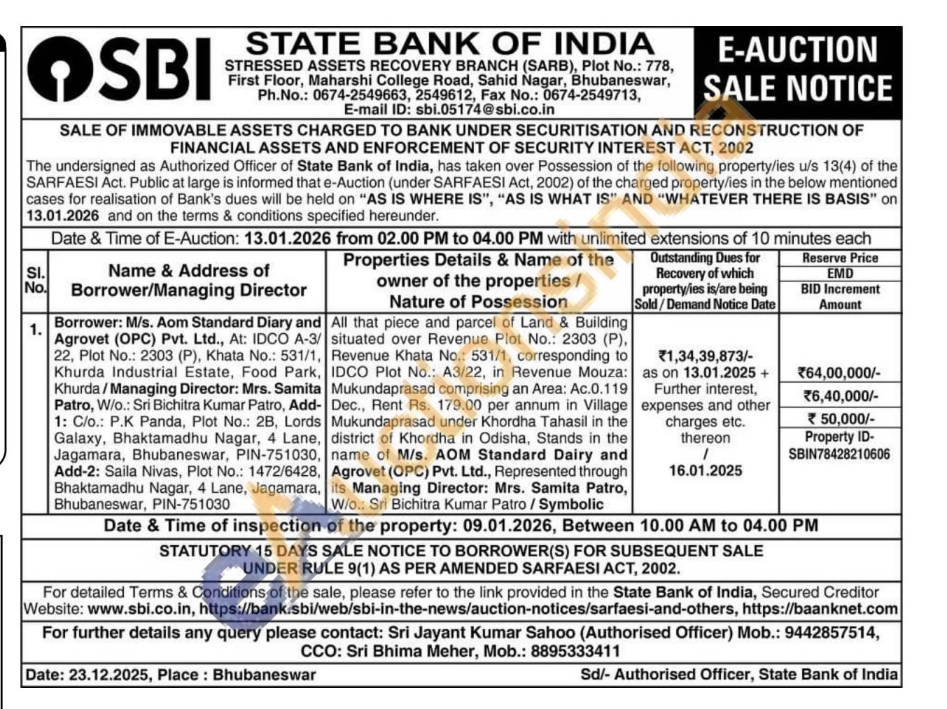 All that piece and parcel of Land & Building / situated over Revenue Plot No.: 2303 (P), Revenue Khata No.: 531/1, corresponding to IDCO Plot No.: A3/22, in Revenue Mouza: Mukundaprasad comprising an Area: Ac.0.119 Dec., Rent Rs. 179.00 per annum in Village Mukundaprasad under Khordha Tahasil in the district of Khordha in Odisha, Stands in the name of M/s. AOM Standard Dairy and Agrovet (OPC) Pvt. Ltd., Represented through its Managing Director: Mrs. Samita Patro, W/o.: Sri Bichitra Kumar Patro / Symbolic