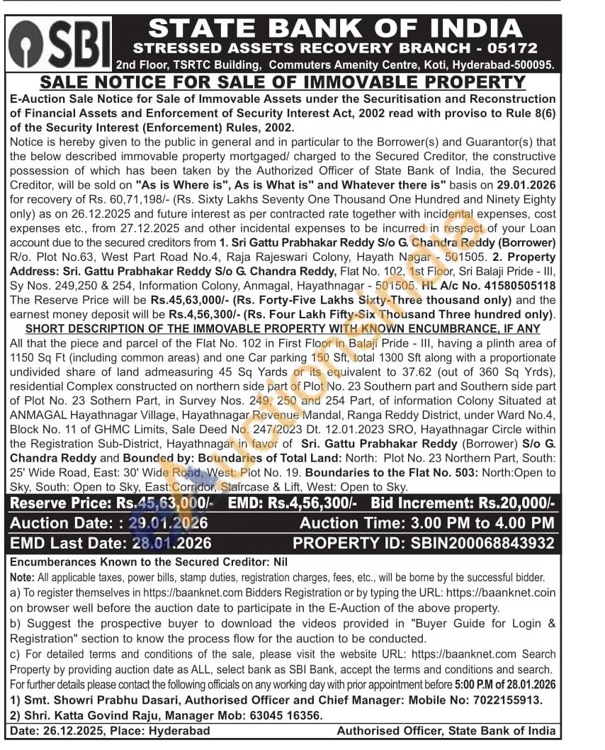All that the piece and parcel of the Flat No. 102 in First Floor in Balaji Pride III, having a plinth area of 1150 Sq Ft (including common areas) and one Car parking 150 Sft, total 1300 Sft along with a proportionate undivided share of land admeasuring 45 Sq Yards or its equivalent to 37.62 (out of 360 Sq Yrds), residential Complex constructed on northern side part of Plot No. 23 Southern part and Southern side part of Plot No. 23 Sothern Part, in Survey Nos. 249, 250 and 254 Part, of information Colony Situated at ANMAGAL Hayathnagar Village, Hayathnagar Revenue Mandal, Ranga Reddy District, under Ward No.4, Block No. 11 of GHMC Limits, Sale Deed No. 247/2023 Dt. 12.01.2023 SRO, Hayathnagar Circle within the Registration Sub-District, Hayathnagar in favor of Sri. Gattu Prabhakar Reddy (Borrower) S/o G. Chandra Reddy and Bounded by: Boundaries of Total Land: North: Plot No. 23 Northern Part, South: 25' Wide Road, East: 30' Wide Road, West: Plot No. 19. Boundaries to the Flat No. 503: North: Open to Sky, South: Open to Sky, East: Corridor, Staircase & Lift, West: Open to Sky