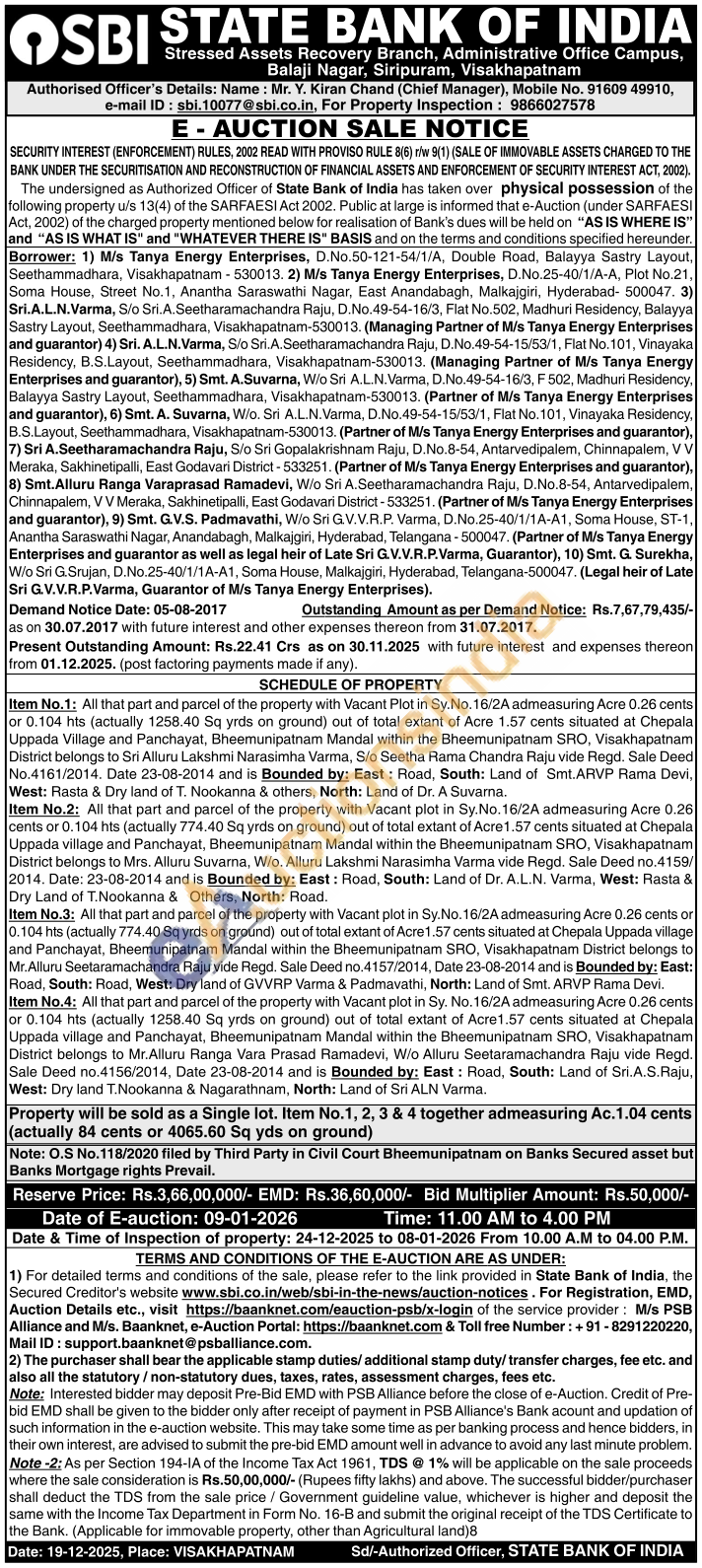 Item No.1: All that part and parcel of the property with Vacant Plot in Sy.No.16/2A admeasuring Acre 0.26 cents or 0.104 hts (actually 1258.40 Sq yrds on ground) out of total extant of Acre 1.57 cents situated at Chepala Uppada Village and Panchayat, Bheemunipatnam Mandal within the Bheemunipatnam SRO, Visakhapatnam District belongs to Sri Alluru Lakshmi Narasimha Varma, S/o Seetha Rama Chandra Raju vide Regd. Sale Deed No.4161/2014. Date 23-08-2014 and is Bounded by: East: Road, South: Land of Smt. ARVP Rama Devi, West: Rasta & Dry land of T. Nookanna & others, North: Land of Dr. A Suvarna. Item No.2: All that part and parcel of the property with Vacant plot in Sy. No. 16/2A admeasuring Acre 0.26 cents or 0.104 hts (actually 774.40 Sq yrds on ground) out of total extant of Acre 1.57 cents situated at Chepala Uppada village and Panchayat, Bheemunipatnam Mandal within the Bheemunipatnam SRO, Visakhapatnam District belongs to Mrs. Alluru Suvarna, W/o. Alluru Lakshmi Narasimha Varma vide Regd. Sale Deed no.4159/2014. Date: 23-08-2014 and is Bounded by: East: Road, South: Land of Dr. A.L.N. Varma, West: Rasta & Dry Land of T.Nookanna & Others, North: Road. Item No.3: All that part and parcel of the property with Vacant plot in Sy.No. 16/2A admeasuring Acre 0.26 cents or 0.104 hts (actually 774.40 Sq yrds on ground) out of total extant of Acre 1.57 cents situated at Chepala Uppada village and Panchayat, Bheemunipatnam Mandal within the Bheemunipatnam SRO, Visakhapatnam District belongs to Mr.Alluru Seetaramachandra Raju vide Regd. Sale Deed no.4157/2014, Date 23-08-2014 and is Bounded by: East: Road, South: Road, West: Dry land of GVVRP Varma & Padmavathi, North: Land of Smt. ARVP Rama Devi, Item No.4: All that part and parcel of the property with Vacant plot in Sy. No. 16/2A admeasuring Acre 0.26 cents or 0.104 hts (actually 1258.40 Sq yrds on ground) out of total extant of Acre1.57 cents situated at Chepala Uppada village and Panchayat, Bheemunipatnam Mandal within the Bheemunipatnam SRO, Visakhapatnam District belongs to Mr.Alluru Ranga Vara Prasad Ramadevi, W/o Alluru Seetaramachandra Raju vide Regd. Sale Deed no.4156/2014, Date 23-08-2014 and is Bounded by: East: Road, South: Land of Sri.A.S.Raju, West: Dry land T.Nookanna & Nagarathnam, North: Land of Sri ALN Varma,